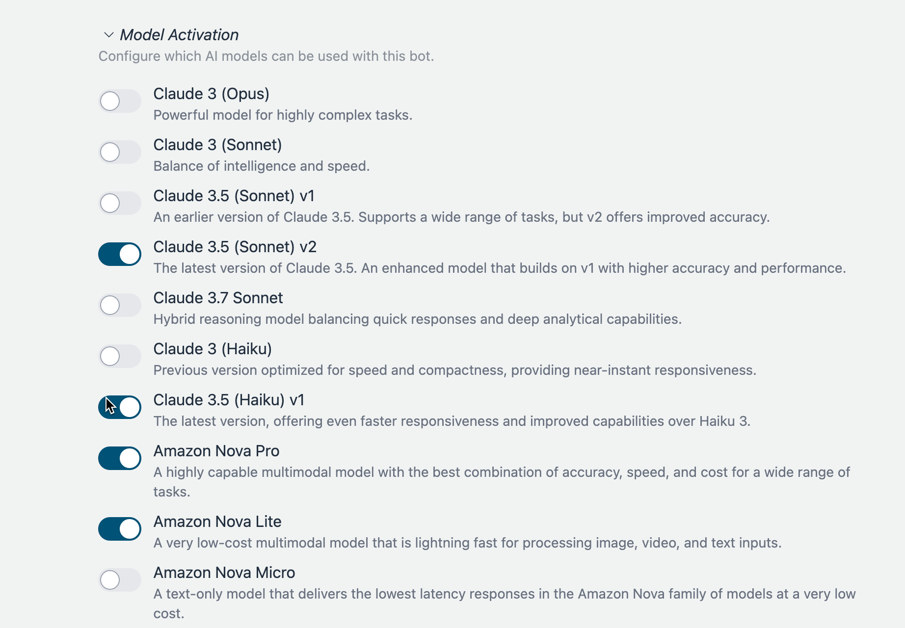問答時,需選擇其中一個剛剛啟用的模型。一般來說,簡易回答可以優先選擇Nova Lite或Haiku,複雜的問題可以選擇Nova Pro或Sonnet。