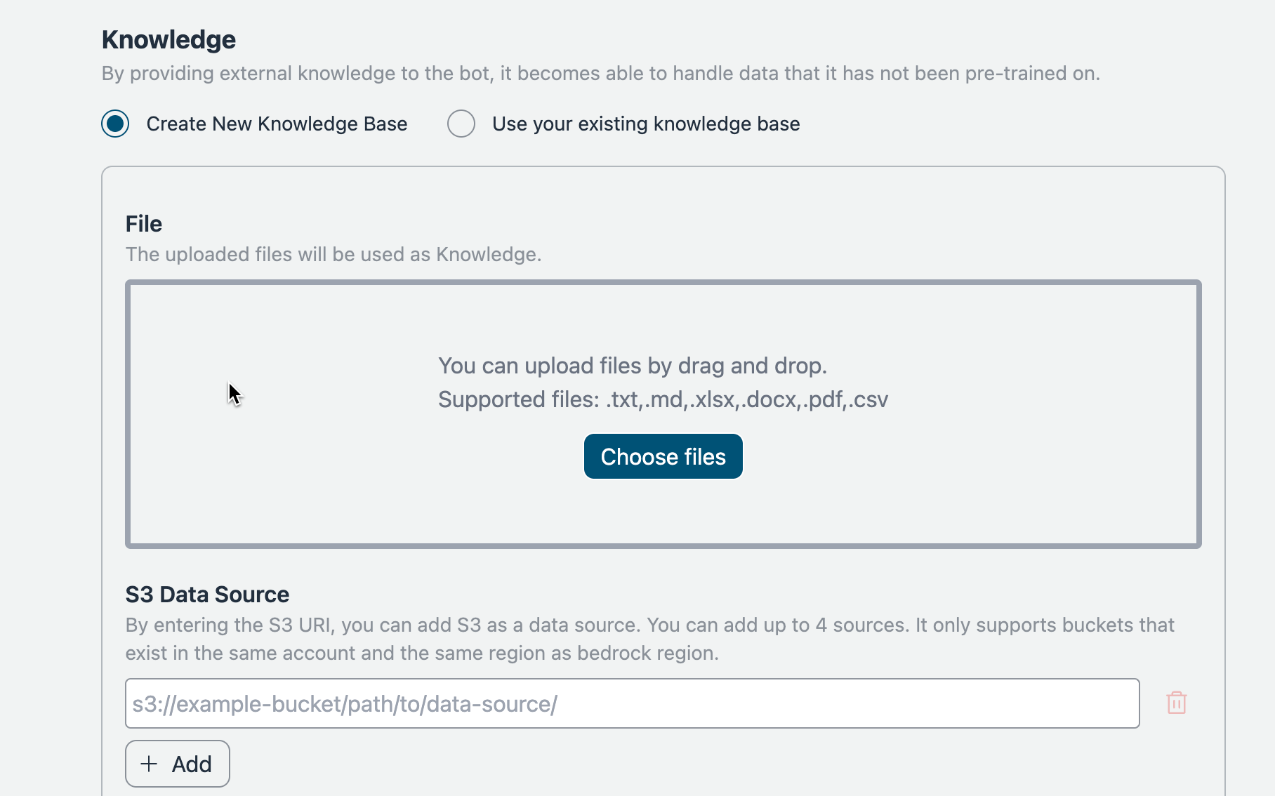 - Create New Knowledge Base - File 直接透過chatbot網頁上傳檔案。適合快速測試或少量檔案的場景。