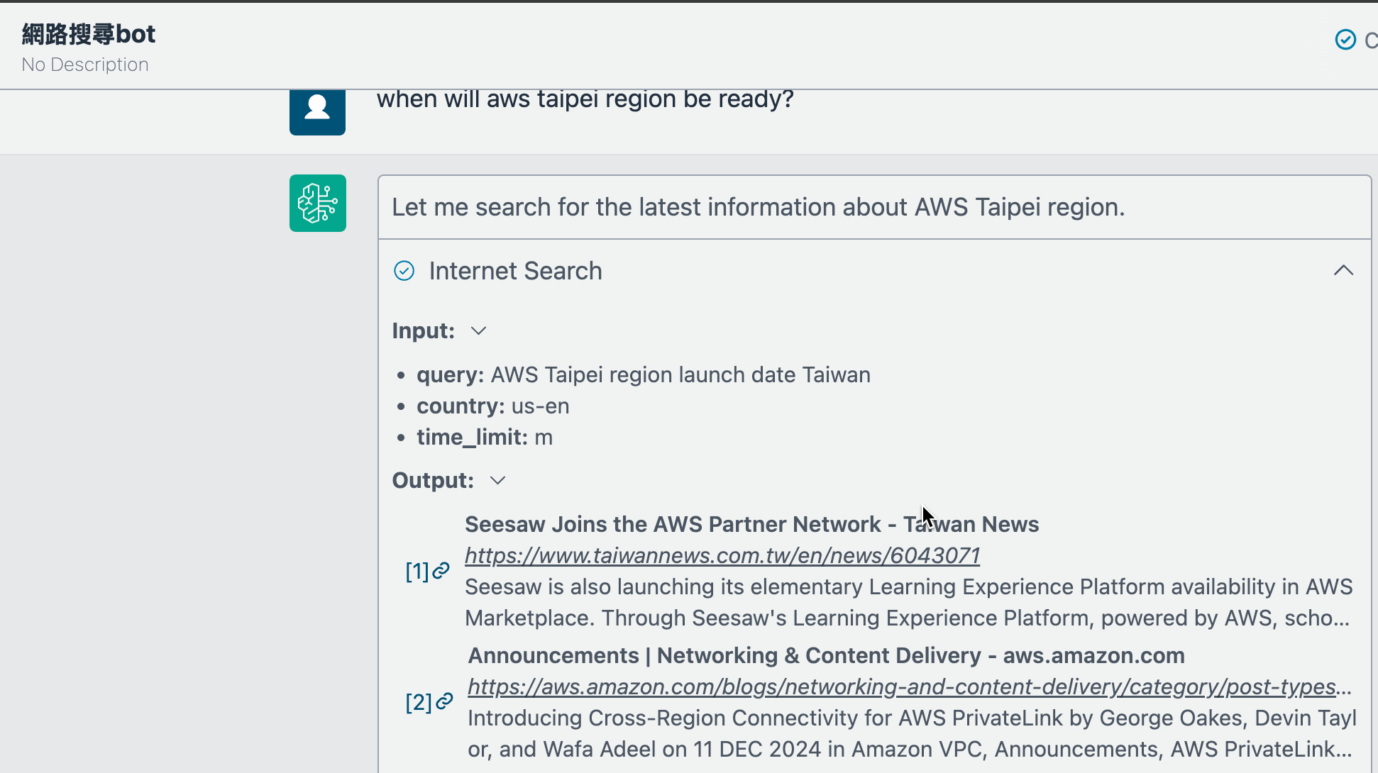 之後使用時,先選擇創建的bot,然後再進行提問,程式即會先就問題搜尋結果,然後閱讀理解後,再進行回答。